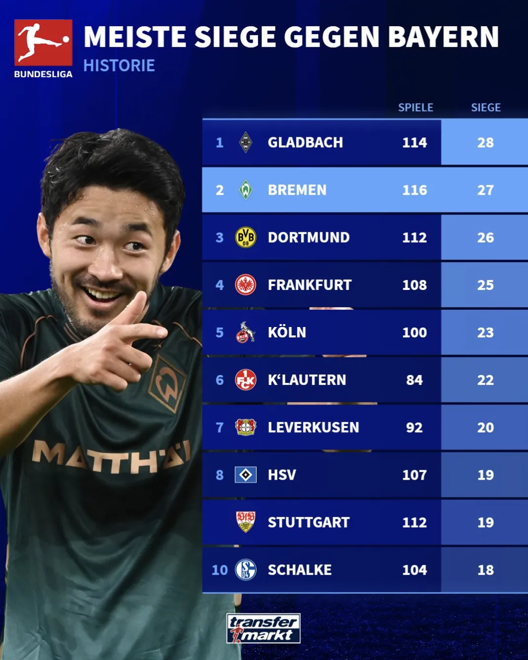 门兴以28次战胜拜仁排名居首,不莱梅和多特蒙德分别以27和26次排名二三。
