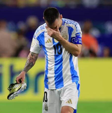 下场的时候,梅西脱掉了自己右脚的球鞋,一边走,一边把它狠狠地摔到地上。坐在替补席,梅西眼泪流了下来,他身边的帕雷德斯安慰他。梅西一开始还用双手掩面,但之后就不再遮掩,任眼泪肆意滂沱地流淌。37岁,2024年美洲杯,人生的第7届美洲杯,也是最后一届美洲杯,没成想却以这种方式结束,梅西内心无法接受。电视画面显示,梅西的伤处是在右脚踝,它已经高高地肿了起来,这显然是第35分钟哥伦比亚队4号右后卫阿里亚斯对他犯规所致。